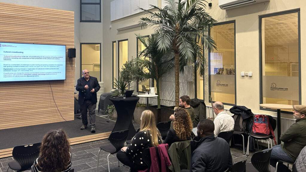 Following lunch, the seminar shifted to an engaging panel discussion in Norwegian, featuring prominent industry voices such as Crister Falck, Anders Rykkja (Queen’s College), Daniel Nordgård (UiA / CreaTeME), Askil Holm (UiA / CreaTeME), and Torfinn McKenzie Juva. The panel examined the complexities of sustainable financing, the role of crowdfunding, and emerging challenges facing Norway’s cultural and creative industries. The discussion underscored the urgency of fostering collaborations between public and private sectors to ensure long-term viability.