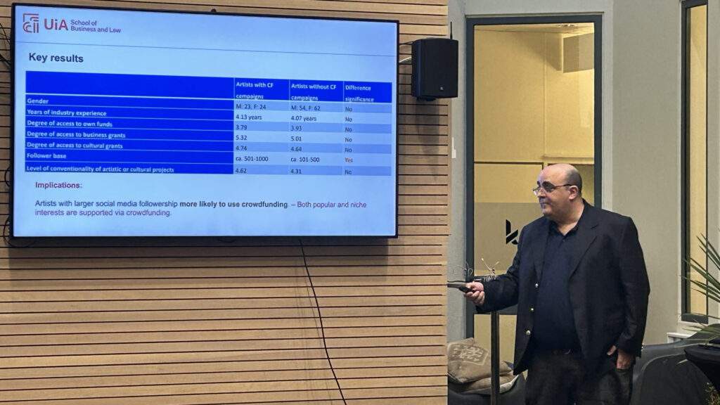 The seminar opened with an overview of the CrowdCul project, delivered by Natalia Maehle from Western Norway University of Applied Science. Maehle detailed the project’s key findings, emphasizing the role of crowdfunding in reshaping cultural financing.